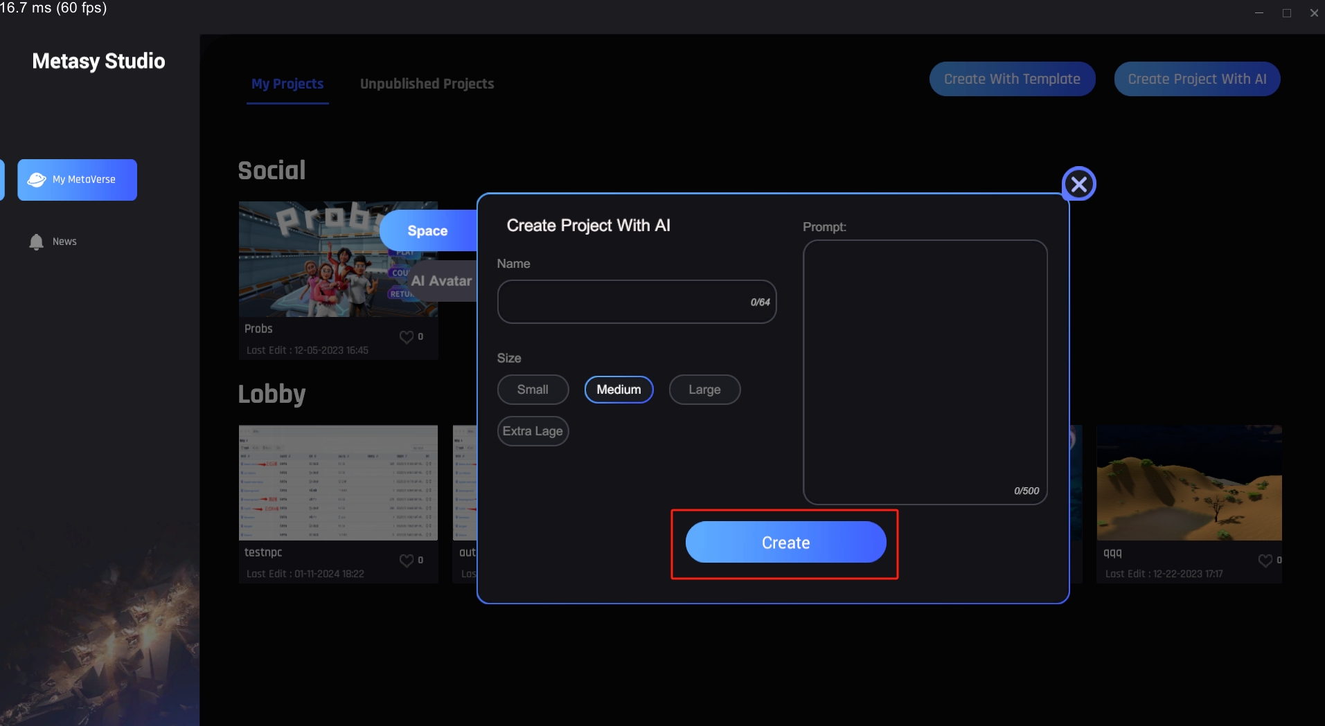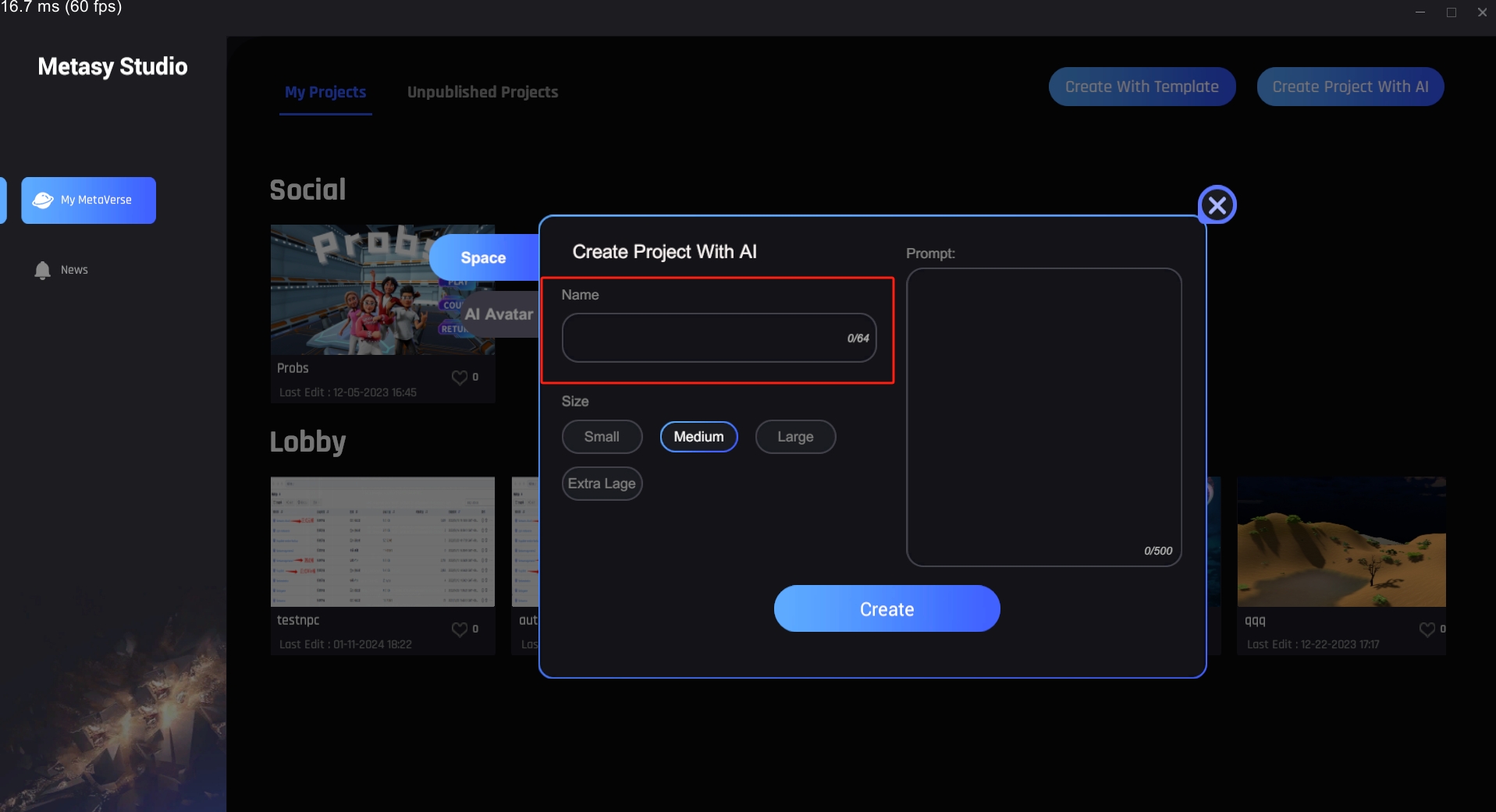 Click to enter the UI interface, set the "Name", "Size", and "Prompt" for the AI-created Space.