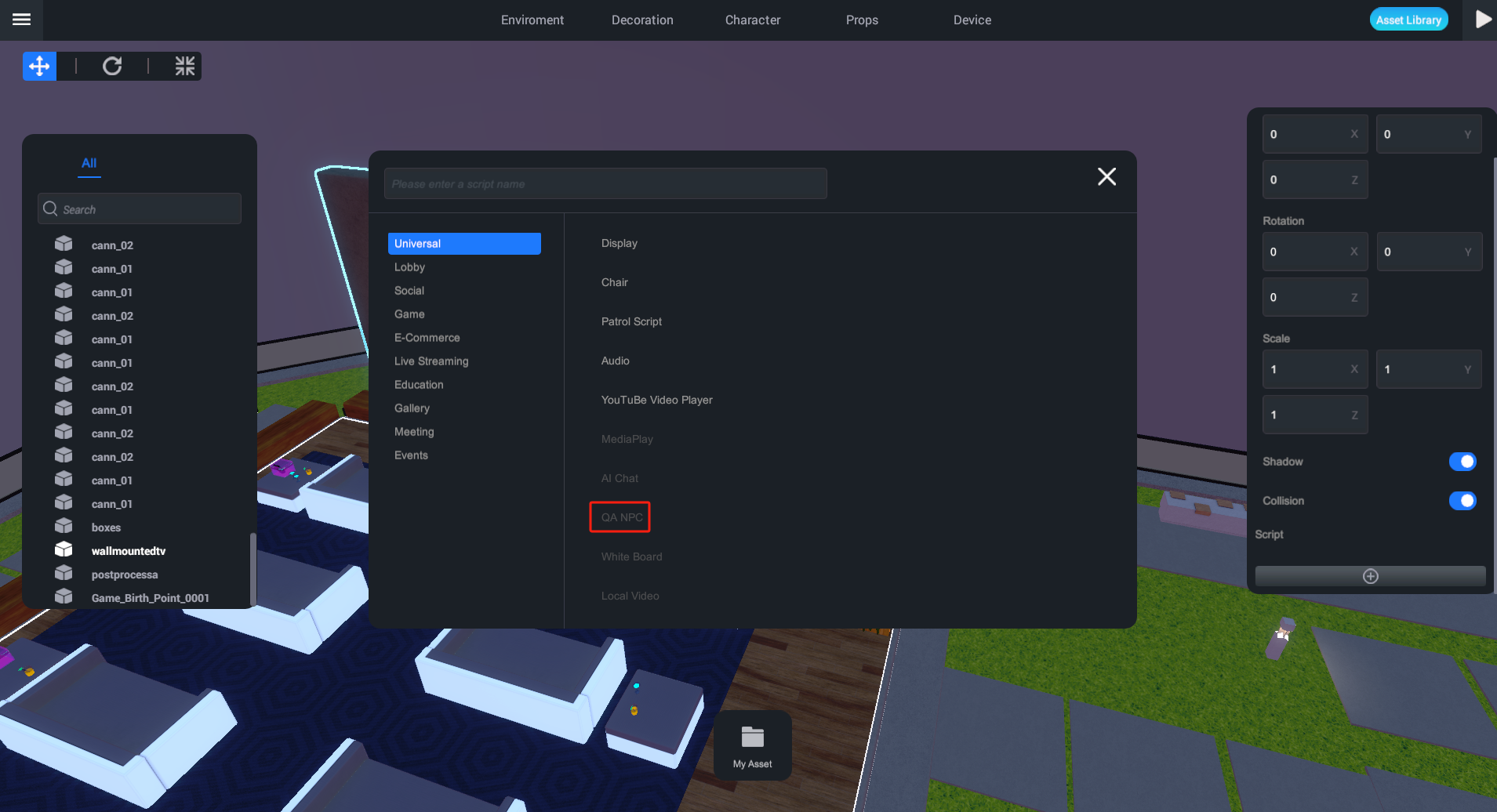Select the object you want to edit, go to the properties panel, > "Script", click "+" to add a script, and select "AIChat". After generating the script, click the edit icon to pop up the UI window.
